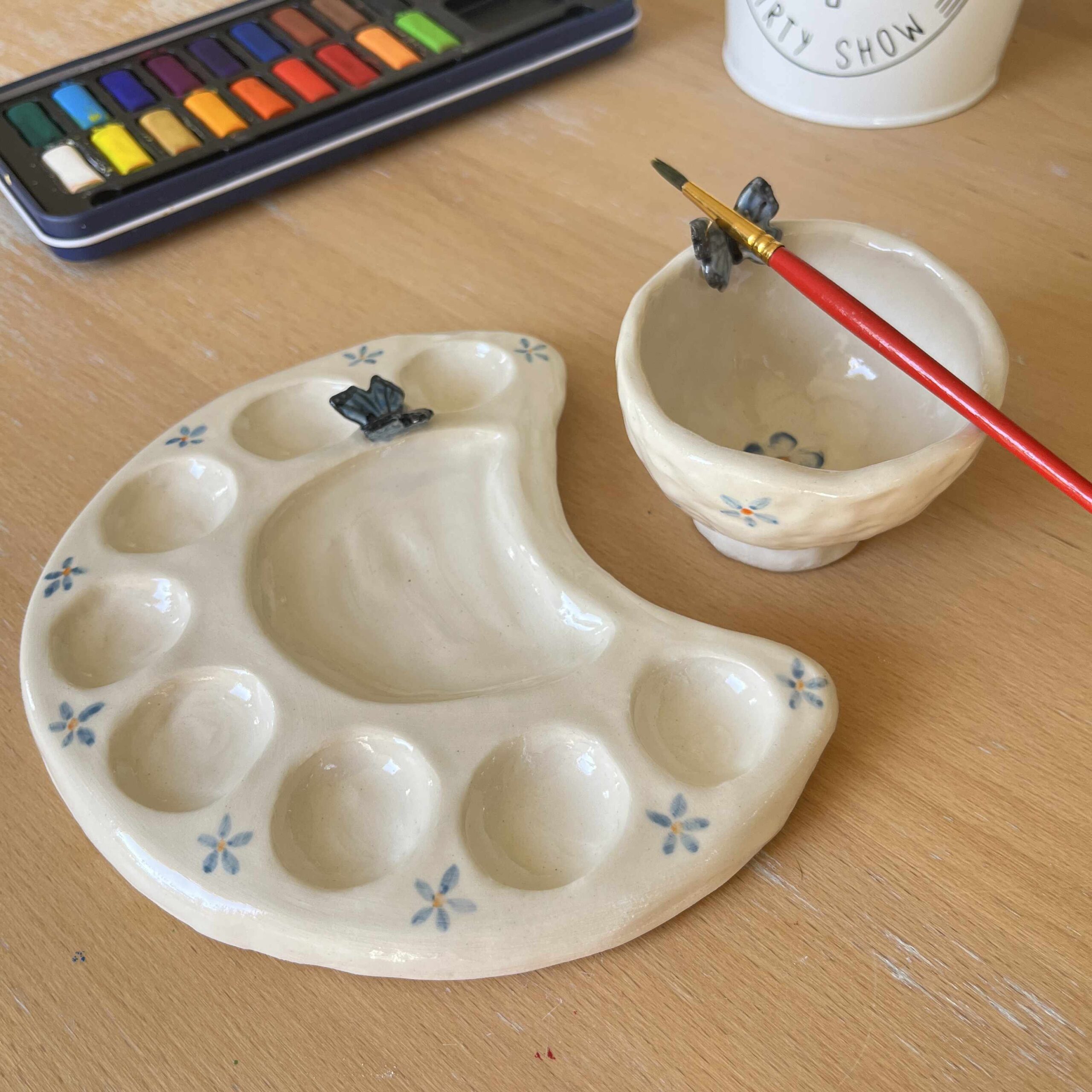 Make a paint palette and its matching water dish.